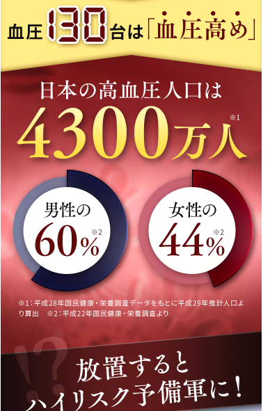 | 日本の高血圧人口は4,300万人 | 男性の60% 女性の44% |