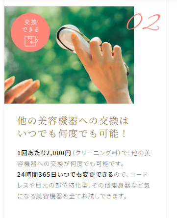 | 他の美顔器への交換は? | いつでも可能 1回あたり2,000円(クリーニング料) でいつでも他の美顔器に何度でも交換可能 |