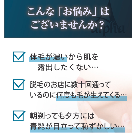 | おすすめの人 | 💁♀️体毛が濃いから肌を露出したくない 💁♀️脱毛のお店に数十回通っているのに何度も毛が生えてくる 💁♀️朝剃っても夕方には青ヒゲが目立って恥ずかしい |