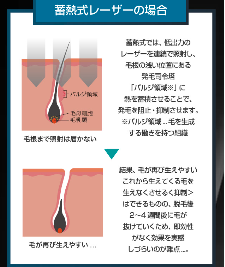 | 蓄熱式の場合 | 蓄熱式では低出力のレーザーを 連続で照射毛根の浅い位置にある発毛司令塔 バルジ領域に熱を蓄積することで 発毛を阻止、抑制させます結果的に毛が生えやすい これから生えてくる絵kを生えなくさせる(抑制) はできるものの脱毛後2-4週間で毛が抜けていくために 即効性がなく効果を実感しずらいのが難点 |