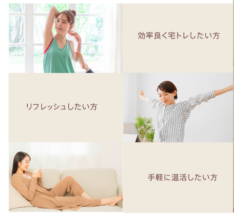 | おすすめの人 | 効率よく筋トレしたい 腰回りの脂肪が気になる リフレッシュしたい 手軽に温活したい |