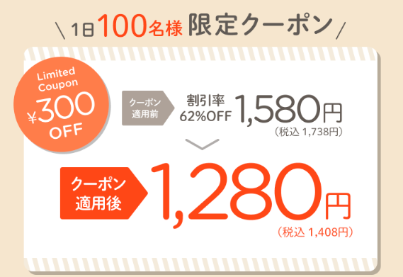 | 何名限定? | 1日100名限定のクーポン割引で めちゃめちゃお得 |