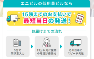 エニピルではアフターピルも取り扱っていますが、 緊急避妊には時間が重要なため、即日配送が可能かどうかは要確認です。 状況によっては最寄りの産婦人科での対面受診を検討してください。