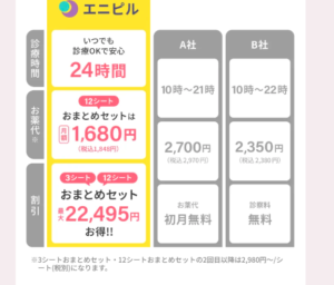 | 割引 | 3シート、12シートおまとめセット最大22.495円お得 | お薬代初月無料 | 診察料無料 |