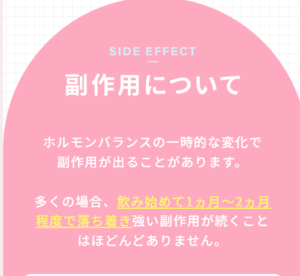 ホルモンバランスの一時的な変化で 副作用が出ることがあります 多くの場合、飲み始めて1-2ヶ月程度で 落ち着き、強い副作用が続くことは ほとんどありません