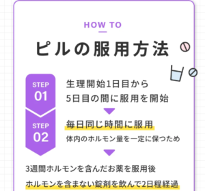 | STEP2 | 毎日同じ時間に服用 体内のホルモン量を一定に保つため |