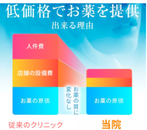| あしたのクリニック | お薬の原価(お薬の質に変化なし) 人件費や店舗の設備を削減 |