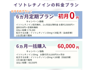 | キャンペーン価格 | イソトレチノイン20mg お薬代月10,000円6ヶ月分 |