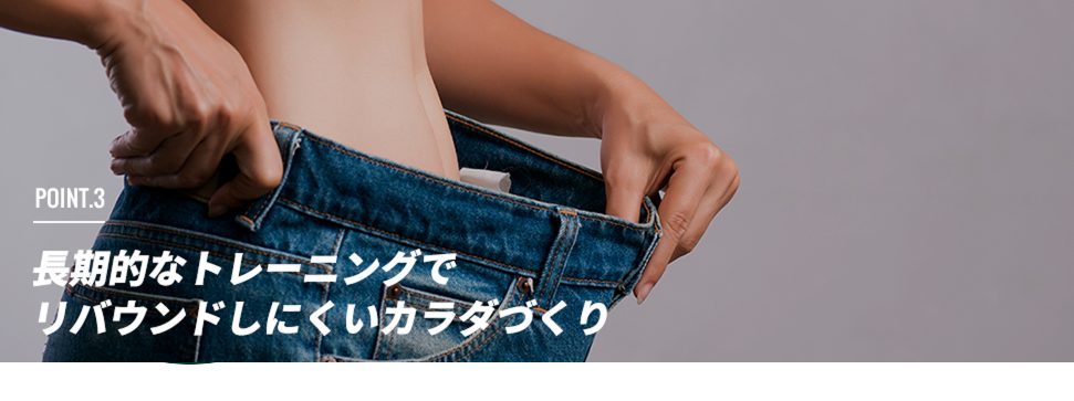 リバウンドしてしまわないか心配です。トレーニング期間終了後に元の食生活に戻り、暴飲暴食が続けば、当然ですが体重は増加しますし、体型も元に戻ってしまいます。重要なのは、トレーニングを続けて「太りにくい状態」になることです。 お客様一人ひとりに合った、トレーニングと食事管理のバランスをトレーナーが示しますので、体型を長く維持でき、リバウンドしにくい体にできます。