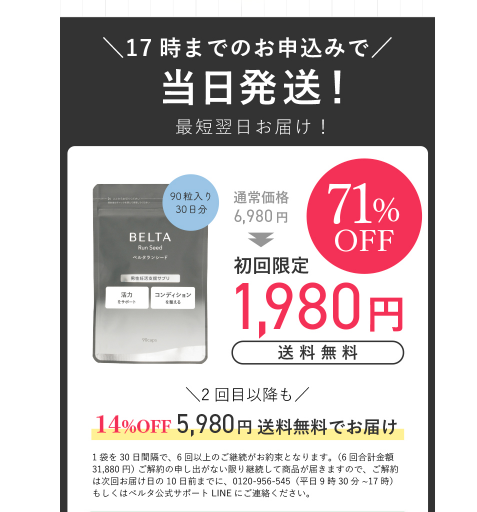 | ベルタランシードの定期初回割引価格 | 71%OFFの1,980円(税込) |