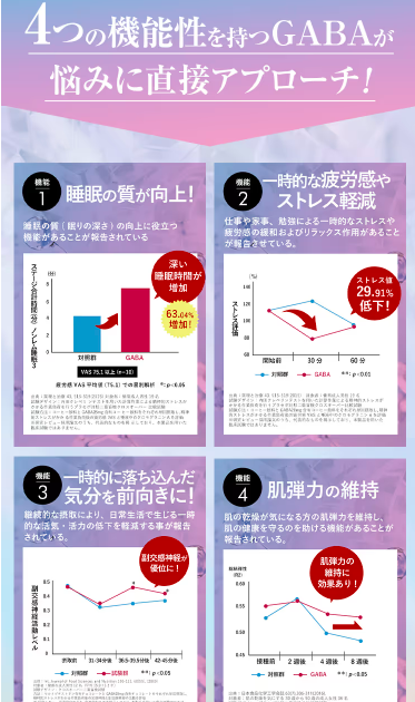 | おすすめの人 | ぐっすり眠りたい 疲労感が増えた 気分が落ち込む 肌のハリ不足が気になる一つでも当てはまる方におすすめ |