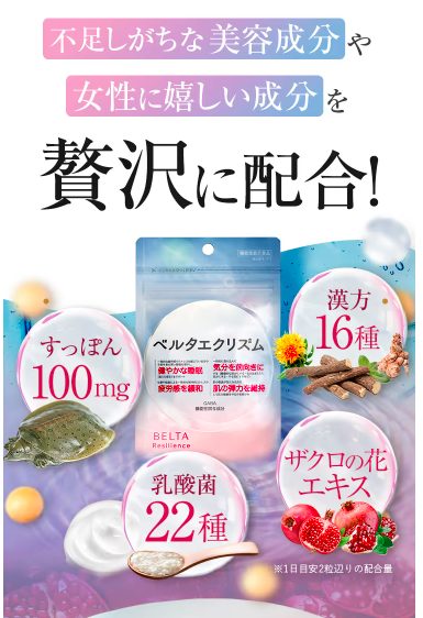 ベルタエクリズムは健康と美容をサポートする成分が豊富に入っていますのでゆらぎが気になりやすい40代以降の方はもちろん、20代、30代の方にもお飲みいただけます。