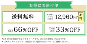 | お得にお届け便の値段 | 通常価格5980円(税抜) 初回2,138円(税込)2回目以降 4,299円(税込) |