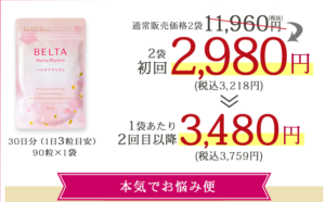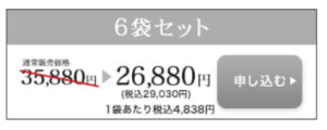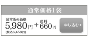 | 本気でお届け便の値段 | 通常価格2袋11,960円(税抜) 初回2袋で 3,218円(税込)2回目以降 1袋あたり 3,759円(税込)x2袋 7,518円(税込) |