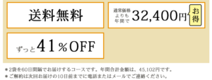 | 年間お届け便の値段 | 通常価格5,980円(税抜) がずっと37,58円(税込) ずっとお得 |