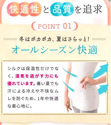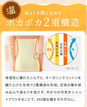 肌にやさしいシルク素材で、お腹まわりをやさしく包み込みながら毎日の冷え対策をサポート。