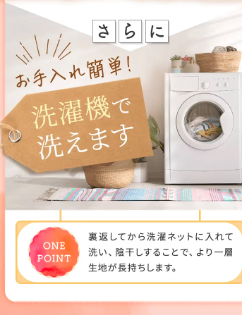 | お手入れ方法を教えてください | 汚れが目立つ際には中性洗剤を使用 小さめの洗濯ネットにいれて |