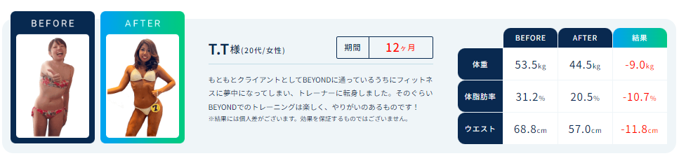 さらに自分の身体の柔軟性やバランスなども考慮しながらメニューも組んでもらえるのでとてもありがたいです。これが今の結果に出ていると思います。今は毎回BEYOND に行くのが楽しいです!引用公式
