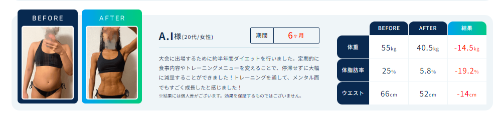 女性らしいしなやかな体に憧れ、トレーニングを始めました。トレーナーさんには、毎回、飽きないメニューを考えていただき、筋トレをすること自体が、楽しいと思うようになりました。トレーニングも食事指導も、私に合ったアドバイスをくださるので、無理なく、楽しみながら続けられています。引き続き、よろしくお願い致します。引用公式