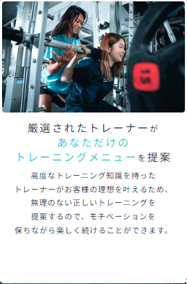 体の特徴に合ったトレーニングプランと優秀なトレーナーが、あなたのボディメイクを徹底してサポートいたします。
