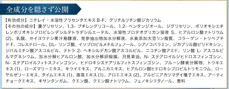 - 整肌・保湿の組み合わせ:ヒアルロン酸、アミノ酸、セラミド様成分、ナイアシンアミド等(いずれも化粧品の保湿・整肌目的)を配合する処方が多い