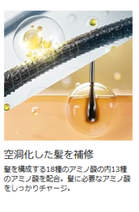 | ピュアアミノ酸 | アミノ酸を豊富に配合 髪に栄養を与えながら 美しさを引き出すだけではなく、 まるで髪に命を吹き込んでいるかのような 感覚へ |