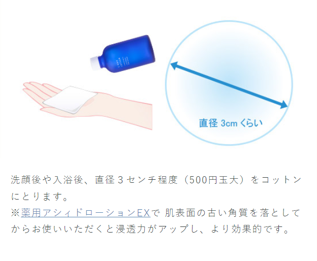 - 洗顔後すぐ、清潔な手のひらに500円玉大を目安にとる(コットン使用可)。