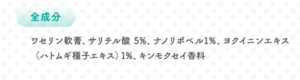 | 有効成分 | ワセリン軟膏 サリチル酸5% ナノリポベル1% ヨクイニンエキス |