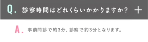 | 診療時間は? | 事前問診で約3分、診察で約3分 |
