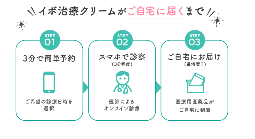カメラ、マイク付きのスマホ、パソコンで受けた後に、最短翌日でクリニックフォアのイボ治療クリームがご自宅に届きます。
