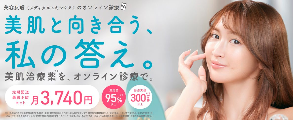 | 東京美肌堂 | オンライン美肌治療専門サービス。ニキビ・シミ・イボなど女性特有の肌悩みに合わせて薬を処方。 | 診察から薬の受け取りまで完全オンライン。自宅でこっそり美肌ケアを続けたい人におすすめ。 | 東京美肌堂の詳しい情報を見る |