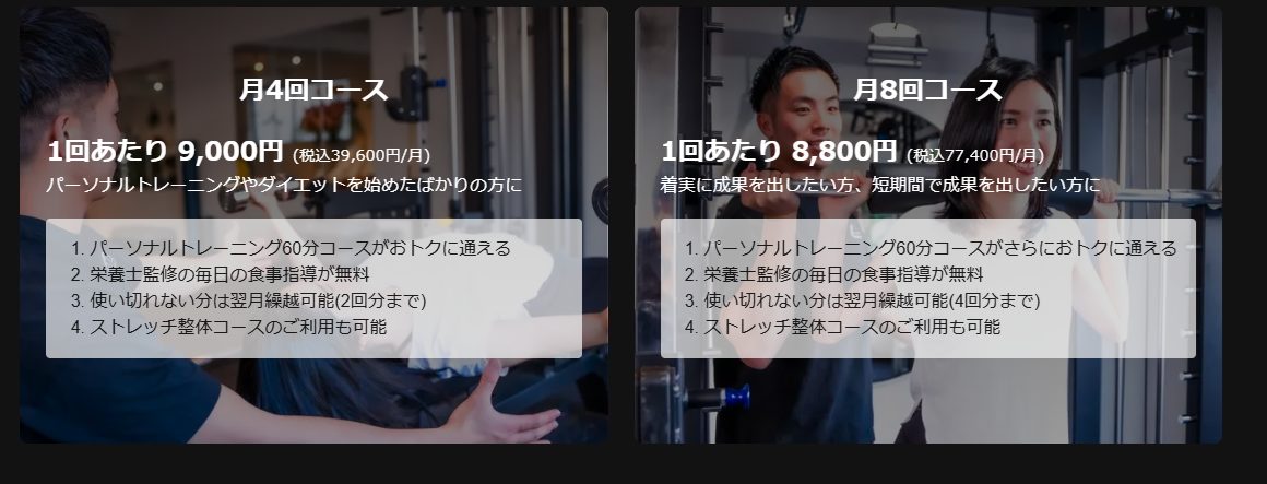 | 月額制プランの値段 | 月4回コース 1回あたり 9,000円 (税込39,600円/月) パーソナルトレーニングやダイエットを始めたばかりの方にパーソナルトレーニング60分コースがおトクに通える 栄養士監修の毎日の食事指導が無料 使い切れない分は翌月繰越可能(2回分まで) ストレッチ整体コースのご利用も可能 月8回コース 1回あたり 8,800円 (税込77,400円/月) 着実に成果を出したい方、短期間で成果を出したい方に |