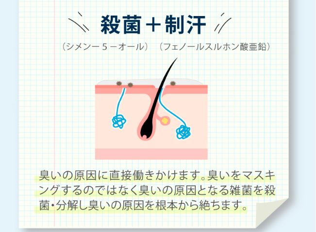 | 殺菌+制汗 (シメン-5-オール) (フェノールスルホン酸亜鉛) | 臭いの原因に直接働きかけます 臭いをマスキングするのではなく、臭いの原因となる 雑菌を殺菌、分解し、臭いの原因を根本から断ちます |