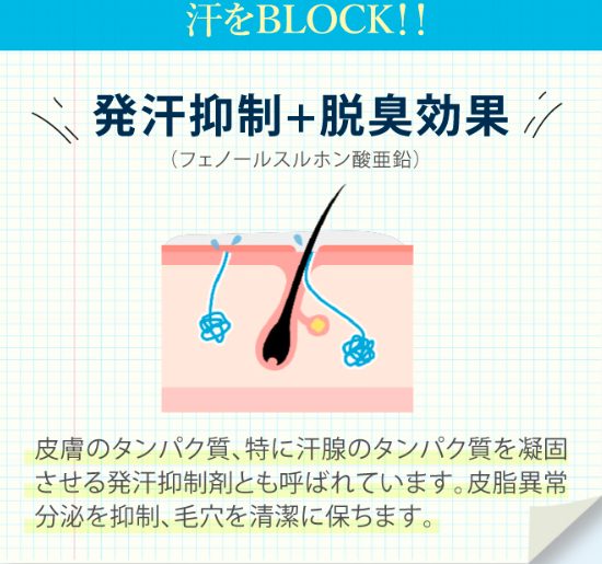 | 発汗抑制+脱臭効果 (フェノールスルホン酸亜鉛) | 脂のタンパク質、特に汗腺のタンパク質を 凝固させる発汗抑制剤と呼ばれます |