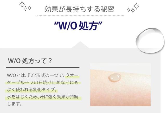 乳化形式の一つで、ウォーターブルーフの日焼け止めにも