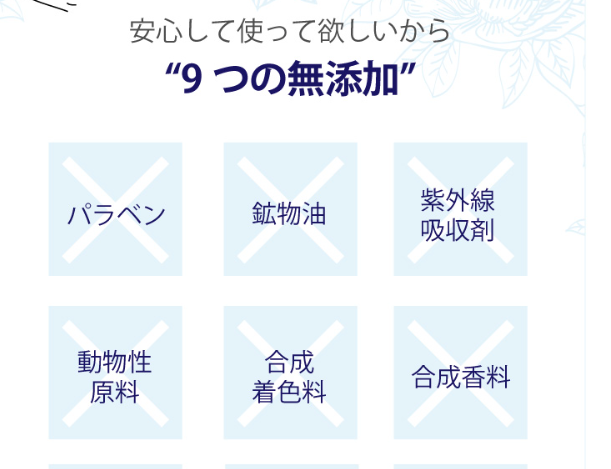 | 敏感肌でも使える? | 9つの無添加で安心 |
