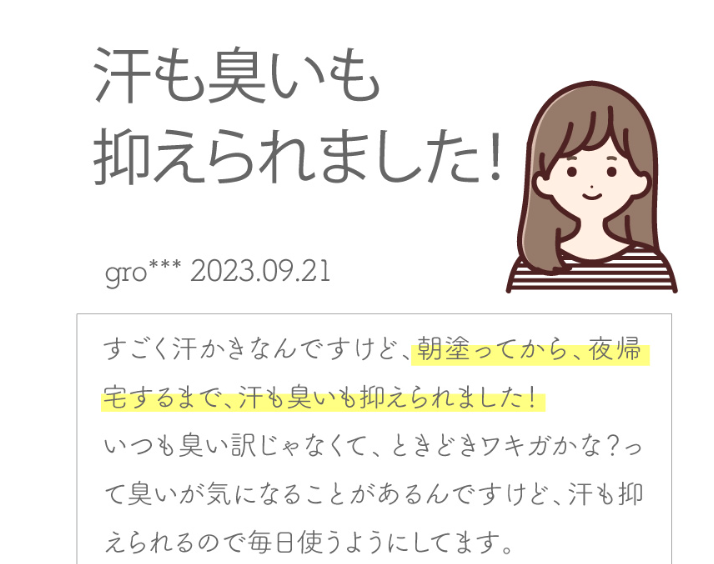 | おすすめの人 | 💁♀️いつでも臭いがしていないか気になる 💁♀️市販の制汗剤で物足りない 💁♀️汗も臭いも両方気になる 💁♀️脇だけではなく、全身の臭いが気になる |