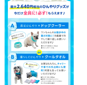 | 特典 | ドクタースゴオチ(歯磨き)1本 ・最大2,640円相当のひんやりグッズ(首元ひんやりドッグクーラーか、クールタオルかのいずれか1つ)がセット |