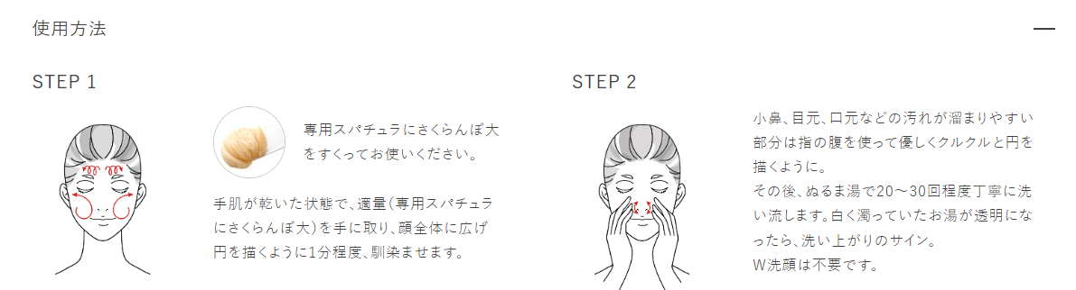 | 使い方 | 専用スパチュラにさくらんぼ大をすくってお使いください。 手肌が乾いた状態で、適量(専用スパチュラにさくらんぼ大)を手に取り、 小鼻、目元、口元などの汚れが溜まりやすい部分は指の腹を その後、ぬるま湯で20~30回程度丁寧に洗い流します。 |