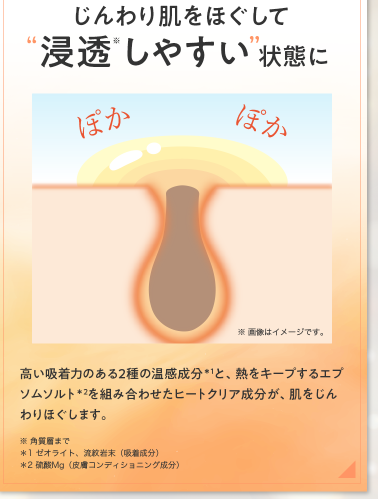 | ●温感を与えてほぐす | 高い吸着力のある 2種の温感成分と 熱をキープする ヒートクリア成分で 肌をじんわりほぐす |