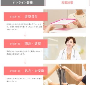 到着してから問診表の記入 スタッフさんから、お薬の説明、診察 会計の流れでだいたい15分くらいととても早かったです 薬の知識が一切ないので全て説明してもらいました 診察に関しては症状の確認と薬の説明がメインです 値段に関しても事前にネットで調べていたので想定内です 引用公式