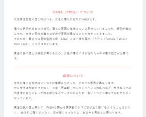 女性男性型脱毛症と呼ばれる、女性の薄毛の総称 薄毛の研究が始まった当初、薄毛の原因に性差はないと思われていましたが、研究が進むにつれ、女性と男性の薄毛は症状や原因が異なることがわかってきました。 そのため、最近では男性型脱毛症(AGA)とは一線を画す、「FPHL(Female Pattern Hair Loss)」とも呼ばれています。 男性の脱毛症とは原因が異なるため、女性の薄毛には女性のためのお薬の処方が必要です。 症状について 女性の薄毛の症状はいくつかの種類に分けられ、それぞれ原因が異なります。 特に女性は加齢だけでなく、出産・更年期・ホルモンバランスの乱れなど、女性ならではの身体の変化によって脱毛症になるケースもあるため、若いうちから薄毛で悩む方も多くなっています。 男性型脱毛症と異なり、FAGAは額から頭頂部にかけて髪が全て抜けるようなことは少なく、 全体的に薄くなったり、髪が細くなったりと、お悩みも男性とは異なります。 【女性の脱毛症の例】 ・女性男性型脱毛症 ・円形脱毛症 ・脂漏性脱毛症 ・産後脱毛症 薄毛の原因は1人ひとり異なるため、あなたの症状に合わせた、最適なお薬の処方は必要不可欠です。