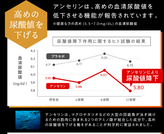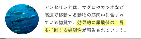 アンセリンは魚肉由来の成分で、尿酸値が高めの方に対する機能が報告されています(機能性表示の範囲)。