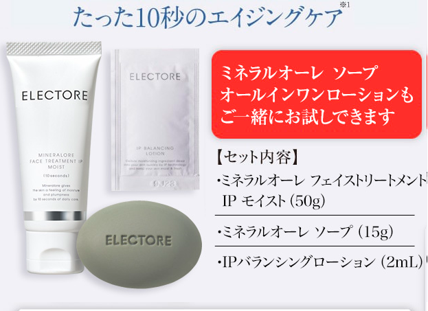 | 内容量 | ミネラルオーレフェイストリートメントIPモイスト(50g) ミネラルオーレソープ(15g) IPバランシングローション(2ml) |