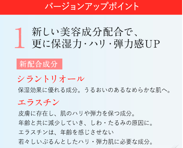 | エラスチン | 皮膚に滞在して、肌のハリや弾力を保つ成分 年齢と共に減少してしまうのでしっかり補給 |