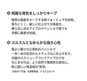 | メリット | 髪色に合わせて合わせやすいカラーバリエーション 描きやすい三角のペン先が便利 保湿成分配合で肌をいたわりながらドローイング |