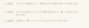 | Step3: | 少量ずつ、軽くパッティングしながらメイクをする。 |