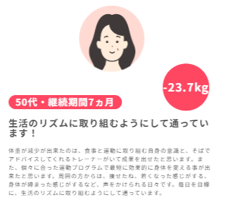 成果を出せたと思いますまた個々に合った運動プログラムで最短に効果的に身体を