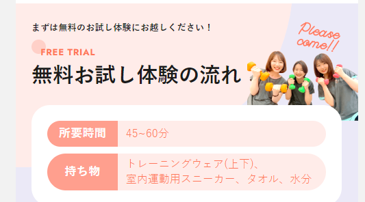 | 体力に自信がない | お客様の体力に応じたプログラムを組むことが可能ですので、ご安心ください。 |