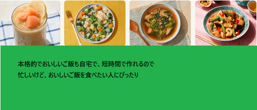- メイン料理からスムージーまで: メインのおかず、スープ、サラダ、スムージーまで、バランスの取れた食事をサブスクでお届け。